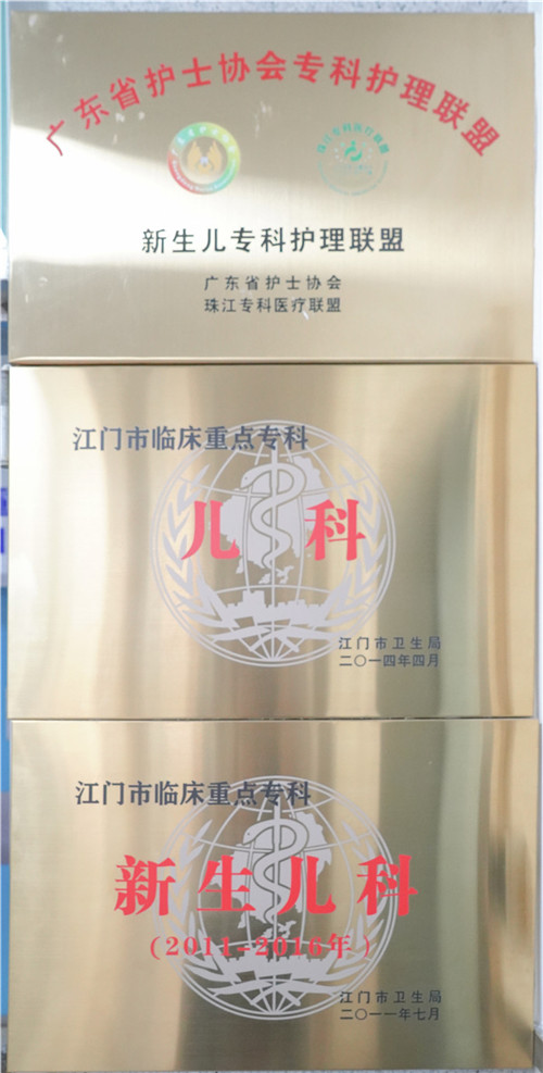 江门市中心医院的新生儿重症监护病区于2011年被评为江门市重点专科,现为江门市急危重新生儿救治中心,配备有医师10名、护理人员34名。病区有主任医师2人、副主任医师3人、副主任护师2人、主治医师2人、硕士研究生导师1人、广东省杰出青年人才1人、岭南名医2人、江门市名医2人。