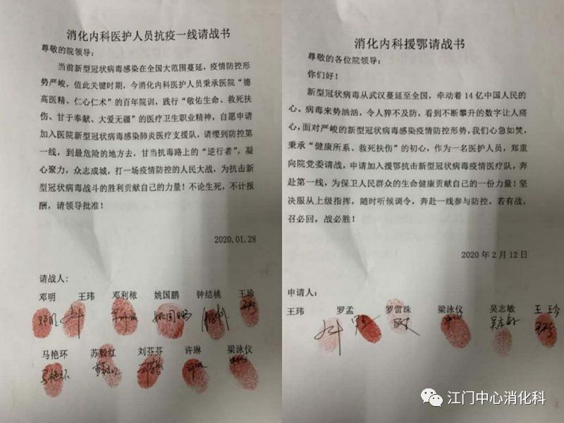 江门市中心医院消化内科医护人员签字援鄂、本院感染科支援请战书