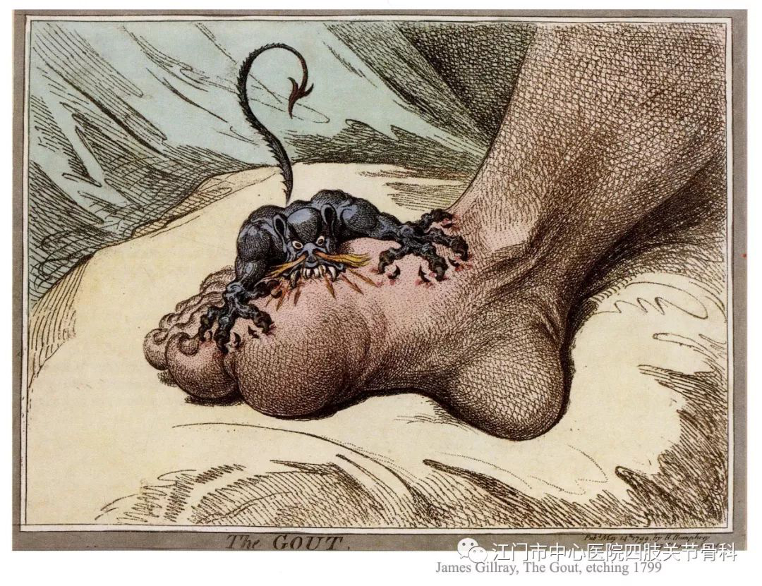 若你对自身的痛风漠不关心、不屑一顾,那痛风便会反复发作,慢慢地痛风石沉积,严重地会引起关节炎以及肾脏受损。痛风之痛,早在英国漫画家Jame Gillray曾在1799年发表的《The Gout》中有过形象的描绘。17世纪外国Thomas Sydenham医生曾这样描述: “病人上床睡觉并安静地睡到凌晨两点左右,从尖锐疼痛中惊醒,像有东西抓住巨大的脚趾,时而到脚跟、小腿、踝关节、类似于脱臼的疼痛,接着是发冷、发抖、发热。从起初轻度的疼痛感愈演愈烈,到无法忍受衣服的重量,甚至无法忍受房间里脚步引起的震动。”