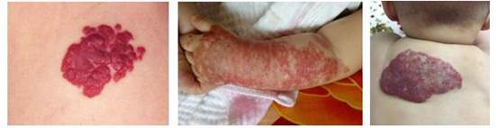3.混合型血管瘤:累及较深层组织,结构复杂,常可形成包块,局部呈暗红色或蓝紫色;