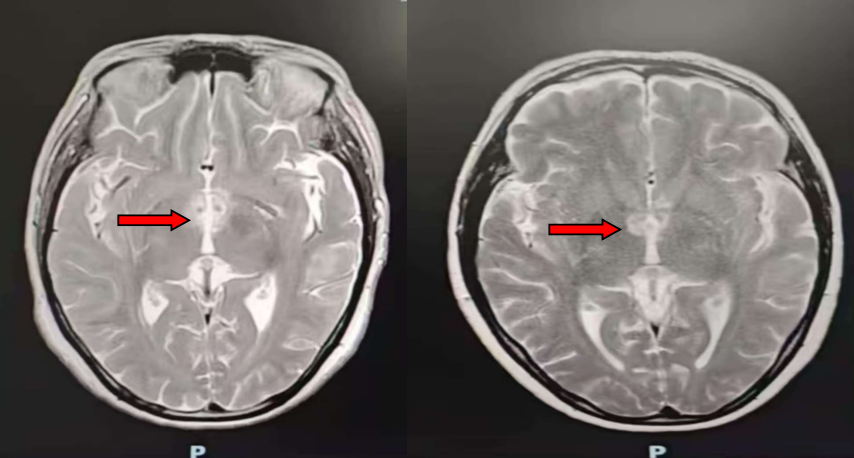 △治疗前头颅MR提示双侧丘脑内侧、灰结节脑实质异常信号影