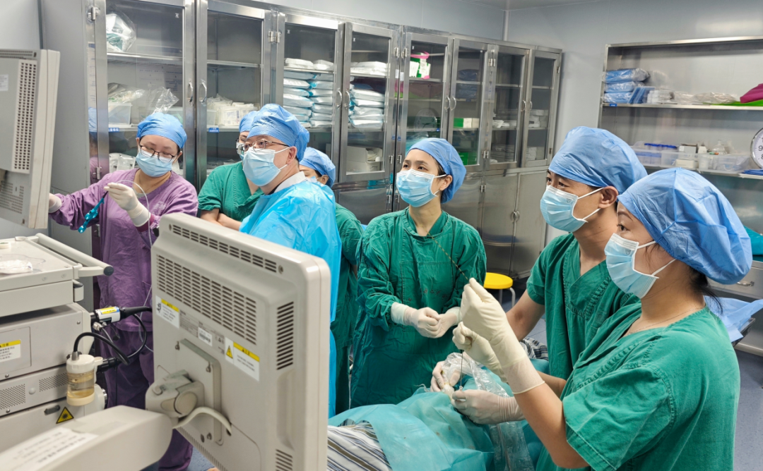 在征得患者和家属的同意后,手术正式开始了。手术当天,首先由医学超声科主任阮健秋带领的介入团队在超声引导下,用穿刺针把导丝置入胆管中。穿刺针在冯伯的上腹经皮经肝缓缓进入体内,在超声定位的护航下,穿刺针一点一点推进。大家全神贯注地盯着屏幕上闪烁的超声影像,根据多次跟消化科联合治疗的经验,团队顺利找到了术前预定的导丝放置位置,随后把导丝准确地放到十二指肠内,完成了关键的“开路”操作。