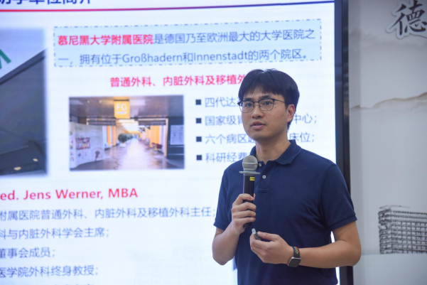 本次读书会特邀胃肠外科医生——王成兴博士作海外研修分享。王成兴于去年下半年赴德国慕尼黑大学附属医院进行为期半年多的访学,他从德国的医疗体系、医院管理模式、医生的成长路径,到机器人手术的广泛应用、严谨的术前准备与术中协作,逐一娓娓道来。他还特别分享了所在实验室的科研氛围——“封闭式头脑风暴”、跨学科合作的便利性,以及自己在德期间取得的科研突破,包括多项研究成果的发表与顶级会议的参与。