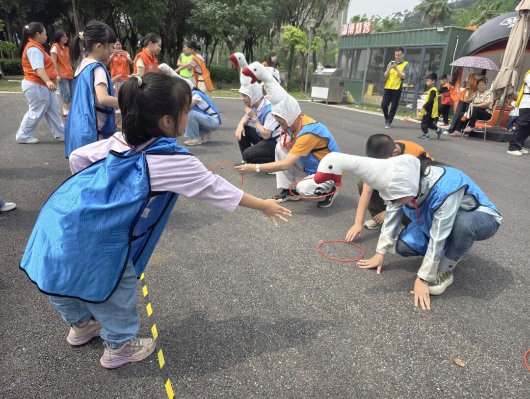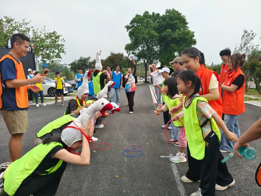家长们佩戴着造型可爱的大鹅头套,在规定区域内有序站立;小朋友们手持大号套圈,于指定线外就位,瞄准目标后轻轻抛出套圈。每一次成功套中“大鹅”,现场便响起热烈的掌声与欢呼声。孩子们兴奋的脸上洋溢着成功的喜悦,家长们则与孩子们一同沉浸在欢乐的游戏氛围之中。
