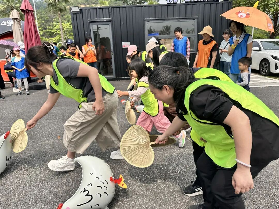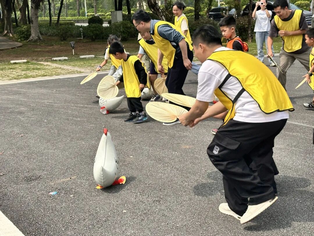 “赶鸡入笼”游戏主要考察亲子间的协作能力。参与活动的亲子家庭手持扇子,借助扇风动作引导道具鸡向笼内移动。活动过程中,道具鸡不得越过规定边界,要求亲子双方紧密配合,精准把控施力大小与方向,锻炼了双方的观察力、提高了沟通效率与应变能力。当“小鸡”稳稳入笼时,亲子相视一笑,成就感油然而生。