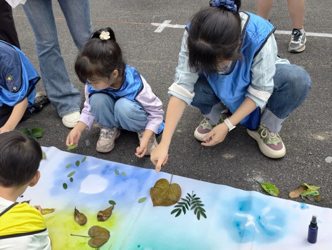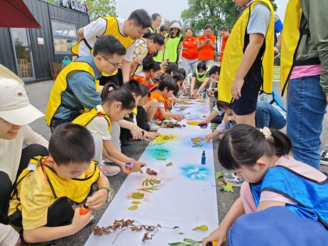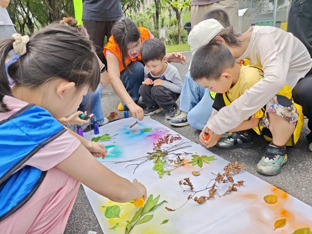 亲子家庭在长5米的画布上开展颜料喷画创作活动。他们共同将收集到的落叶与落花,小心放置于画布表面,喷上颜料,将春日的印记拓印在画布之上。一幅充满创意与童趣的作品随即呈现于众人眼前,寄托着亲子们对春天的喜爱以及对美好生活的憧憬。