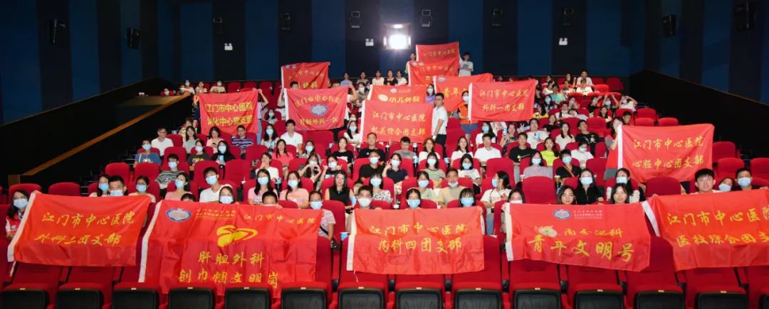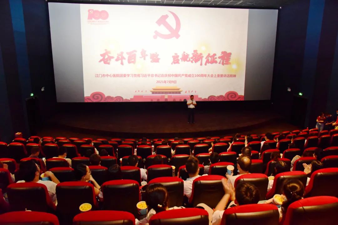 为唤起团员青年齐心抗疫的回忆和激情,弘扬传承仁济精神,进一步增强医院各团支部共青团员的凝聚力、归属感及时代使命感,江门市中心医院团委内科三团支部、内科四团支部、机关综合团支部、肿传综合团支部、心脏中心团支部、消化中心团支部、外科一团支部、外科二团支部、门急诊团支部、医技综合团支部共10个集体自发组织团员青年约200人于7月9日19:00在市区电影院开展了“感谢‘疫’路有你 共筑抗疫长城”观影《中国医生》主题团日活动。 院团委专职副书记徐建华受邀参加了活动,观影前,先带领团员青年们学习了习近平总书记在庆祝中国共产党成立100周年大会上的重要讲话,号召团员青年们通读全文,学深学透,认真领会重要讲话精神。期间,着重围绕有关习近平总书记在重要讲话中充分肯定、殷切勉励、深情寄语青年,强调“未来属于青年,希望寄予青年”等重要内容展开了讨论。并希望广大团员青年,切实把讲话精神全面贯彻落实到实际工作中。