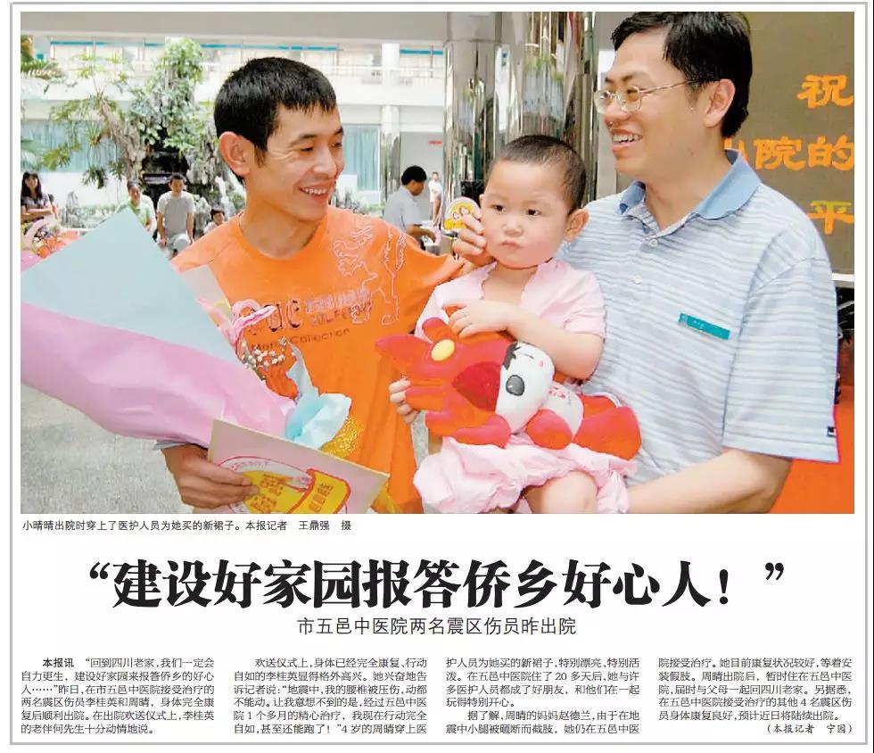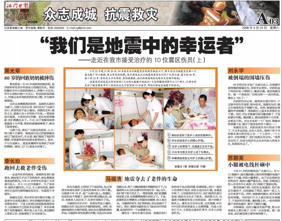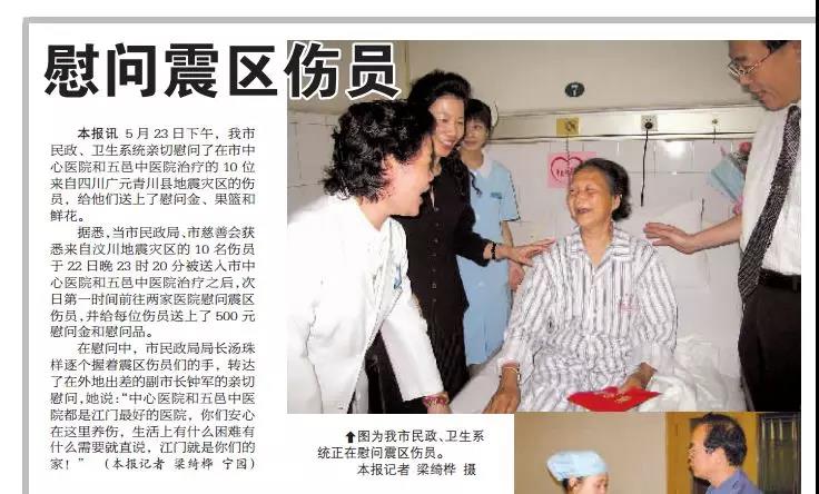 “在自然灾害面前人是很渺小的,就像一颗尘埃在宇宙当中,没办法对抗自然界的力量 。正是这样,更充分展示了我们的医务人员群体是一个恪尽职守,救死扶伤,精益求精的群体;我们的军队是一支听党指挥,来之能战,战之能胜的队伍;我们的人民是一个一方有难,八方支援,友爱互助的大家庭。可谓人间自有真情在!”作为亲历者,时任五邑中医院院长、党委书记,现任江门市中心医院院长、党委副书记的李宇明,回忆起了那场地震对于他的最大感触。